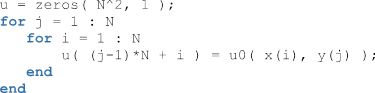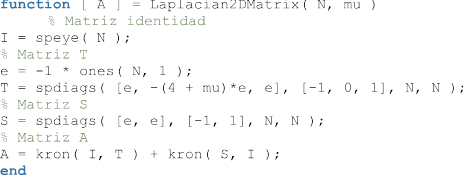 está definido en (9). Luego de obtener dicho sistema, es necesario resolverlo por algún método directo o iterativo. En el fragmento de código anterior se emplea la instrucción u = A \ b, correspondiente al método de Eliminación Gaussiana, el cual es un método directo poco estable y poco eficiente. Aunque cabe mencionar que la implementación de MATLAB® es de las más eficientes que existen, dado que además realiza los cálculos en paralelo (ver, por ejemplo, Hahn y Valentine (2016)).