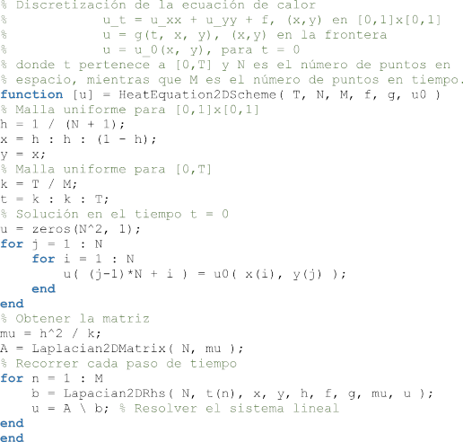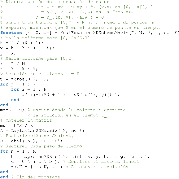 Nótese que esta nueva versión realiza las mismas funciones que la anterior, pero dejando el método de Cholesky como método de resolución por defecto. Además, retorna la malla en espacio y no la solución en el último tiempo, sino que almacena la solución del tiempo en la columna j de una matriz matU de orden