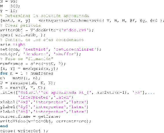 . Así, el objetivo de esta última sección es mostrar cómo crear una película en MATLAB® que permita visualizar la solución del problema (1). Para ello, considere la siguiente modificación del algoritmo presentado en una sección previa: