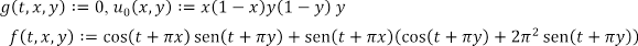 es solución del problema (1). Para luego verificar que la solución obtenida por el algoritmo anterior concuerda (bajo alguna medida del error) con la solución exacta u dada inicialmente. Por ejemplo, entre varias de las funciones u con las que se validó este algoritmo se cuenta con: