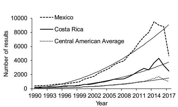For Costa Rica, this translation of active research into tangible products, publicly available online, seems to have been successful in the last years. As a proxy to evaluate such availability of information, when a search (in Spanish) was performed on Google Scholar looking for resources dealing with fungi in association with the different countries in Central America and Mexico, it was evident that Costa Rica had carried out this work more efficiently than the average for the other regional countries (Figure 2). As a comparison, Mexico is very rich in fungal resources and human-fungi interactions, and mycological studies are usually more publicized than in other parts of Latin America due to the mycophilic character of the Mexican population. Even though there are obvious limitations to the analysis of results from this type of public platforms on the internet, they can also provide interesting data for comparison purposes with more professional and specialized databases (Falagas et al., 2008). However, in the end, the availability of fungal information in public and easy-to-use platforms has a higher potential of reaching non-specialized public (non-mycologists), and it is very important for educational purposes.
