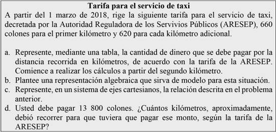 Se espera que los estudiantes, mediante ensayo y error, encuentren la respuesta o, a través de los datos consignados en la tabla, logren hallar una aproximación. Por ejemplo, si 5 kilómetros implican 3140 colones, entonces deberá recorrer más de 20 kilómetros, debido a que