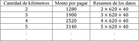 A partir de las columnas anteriores, se puede establecer que si n es la cantidad de kilómetros, se puede calcular el monto por pagar usando alguna de las siguientes dos expresiones: