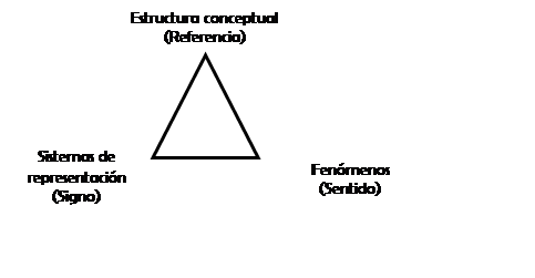 Anteriormente, se ha referido al triángulo semántico de Frege (1998) como fundamento para el estudio del significado de un concepto. Sin embargo, se adopta la propuesta de Rico (1997), con el propósito de establecer el significado de un concepto matemático, mediante 3 organizadores del currículo: estructura conceptual, sistemas de representación y fenómenos (figura 1).