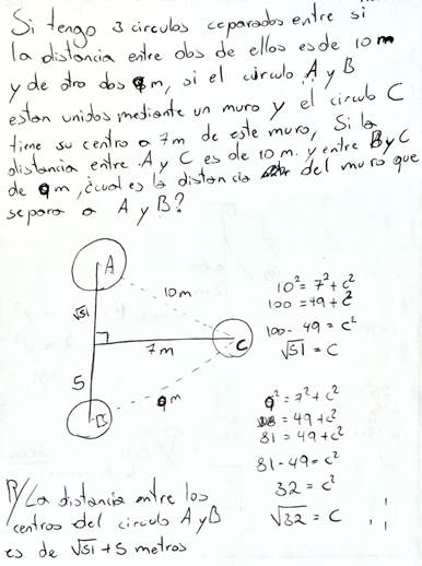 En cuanto a las situaciones sociales y científico-técnicas, que se clasificaron de calidad media, destaca la falta de claridad en su contextualización. Por ejemplo, la figura 10 muestra una situación en la que se combinan elementos de la realidad (muros) con elementos matemáticos (círculos); las demás muestran inconsistencias en la redacción del enunciado y en las dimensiones asignadas a los elementos involucrados de la vida real, como considerar un edificio con una altura de 3 metros.