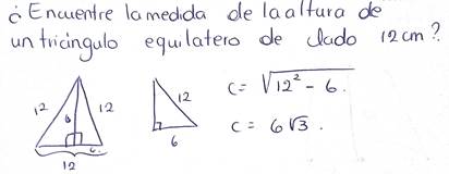 Aquí se acentúa el empleo del Teorema de Pitágoras para determinar la longitud de un segmento (altura) en una figura plana (triángulo equilátero). Además, se reconoce como un caso poco convencional pues se debe averiguar la medida de un cateto en vez de la medida de la hipotenusa.
