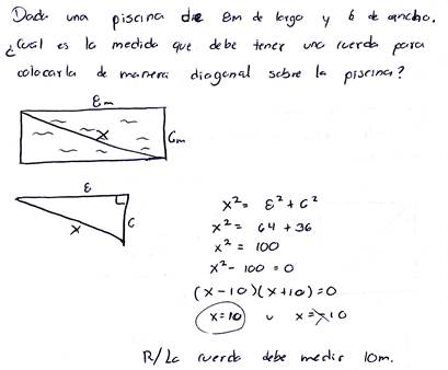 Dentro de las situaciones sociales identificadas se encontraron fenómenos referentes al cálculo de la longitud de objetos como cables y cuerdas; ejemplificado con piscinas o teleféricos (ver figura 3). No obstante, la situación en la que se presenta la tarea carece de sentido, ya que no se identifica el propósito de colocar una cuerda en diagonal; es decir, no hay un problema o una intensión real explícita referida a su ubicación (de la cuerda(. Otros aportes refieren al cálculo del desplazamiento (recorrido) de una persona o un automóvil.