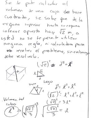 Los contextos área y volumen incluyen pocos fenómenos; para el contexto de volumen solo se refiere a su cálculo particularizado a una caja de base cuadrada, que se modeló con un cubo sin indicar la medida de su diagonal. La figura 8 presenta este caso.
