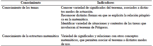 En este sentido, Rojas (2014) establece, mediante una serie de indicadores, un vínculo entre los dominios del conocimiento matemático y los componentes del análisis de contenido matemático. Sin embargo, estos indicadores se plantean a partir del concepto de fracción que, para el propósito de este estudio, fueron adaptados al teorema de Pitágoras. Los indicadores empleados por Castillo, Chaverri-Hernández, Hernández y Vallejos (2017), según los dominios del conocimiento del contenido matemático de Carrillo, Contreras y Flores (2013) para el análisis fenomenológico, se muestran en la tabla 1.