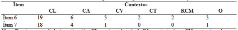 De acuerdo con estos resultados, los docentes participantes consideran una mayor cantidad de contextos cuando plantean una tarea (ítem 6) (al igual que para las situaciones( que cuando se requiere de un enunciado y su solución (ítem 7); es decir, esta diversidad de contextos se reconoce cuando solo deben mencionar los modos de uso del teorema.