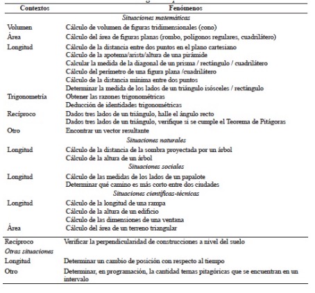 Por otra parte, a partir del análisis del ítem 6, los participantes mencionan algunas tareas en las que puede ser aplicable el Teorema de Pitágoras; esto complementa la información de la tabla anterior. La tabla 5 presenta los fenómenos identificados en cada contexto según el tipo de situación.