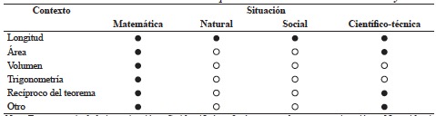 Se observa que las situaciones matemáticas se encuentran distribuidas en una mayor cantidad de contextos, de los cuales destaca el contexto longitud. Además, puede apreciarse que las situaciones de tipo social y científico-técnicas abarcan únicamente el contexto longitud, donde refieren principalmente al cálculo de la medida de los lados de un triángulo rectángulo, un rectángulo o un cuadrado.
