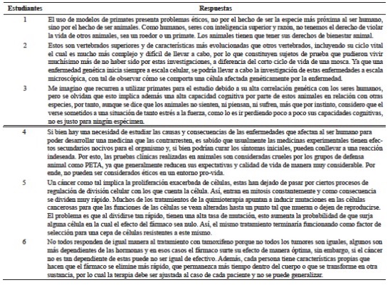 Este mismo autor establece que el argumentador desenvuelve dos procesos: por un lado, el de revisión de la teoría y, por otro, el de reflexión de esta. El primero será el que facilitará una posible transformación en los conocimientos, que ya el estudiantado ha construido. Por su parte, el segundo complementa al anterior, en tanto colabora en el reconocimiento de los alcances de las propias concepciones de los nuevos conocimientos que se adquirieron. Así mismo, se observa en la Tabla 3 que el estudiantado argumenta con términos teóricos de biología (mitosis, mutación, vertebrados, cepa de células, entre otros) y hacen una reflexión del porqué no es ético experimentar con animales o también por qué un medicamento destinado a curar un tipo de cáncer funciona en una persona y en otra no lo hace.