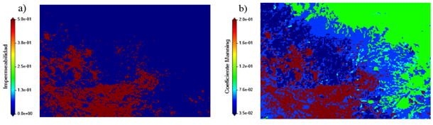 El trabajo expuesto por Ortiz (2009), sirvió como base para la obtención de información relativa a los tipos y usos de suelo en la zona de estudio; además según Chow (1959), se asociaron los coeficientes de rugosidad e impermeabilidad diferenciados para cada uso de suelo; mientras que el trabajo de Schosinski (2006), fue utilizado como base para determinar la profundidad de las raíces de cada tipo de cobertura vegetal. En la Tabla 2 se muestran las coberturas de suelo identificadas, los diferentes factores de impermeabilidad y de rugosidad asociados; un valor de impermeabilización de 0 permite que exista infiltración mientras que un valor de 0.5 permite que exista un 50 % de ella.