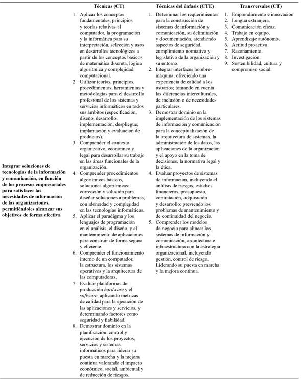 Es una metodología para diseñar las estructuras y los contenidos a partir de competencias profesionales que incluye: perfil de la titulación, el programa de estudios y la trayectoria de quien aprende. Tiene una propuesta de 13 competencias específicas de la disciplina en informática (Tabla 1).