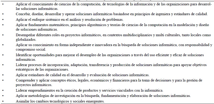 El ACM/IEEE, en el 2013, realizó una iniciativa a fin de generar la nomenclatura recomendada por el IEEE para programas universitarios del área computacional en Latinoamérica. Para este estudio se analizó el documento AIS/ACM/IEEE Computing Curricula 2005 (ver Anexo 2), en el cual se actualizaron las competencias profesionales regionales y los cambios del campo. De los principales resultados, se generaron las competencias para ciencias de la computación, sistemas de información, ingeniería de software, ingeniería computacional, tecnologías de la información y otras disciplinas emergentes de híbridos.