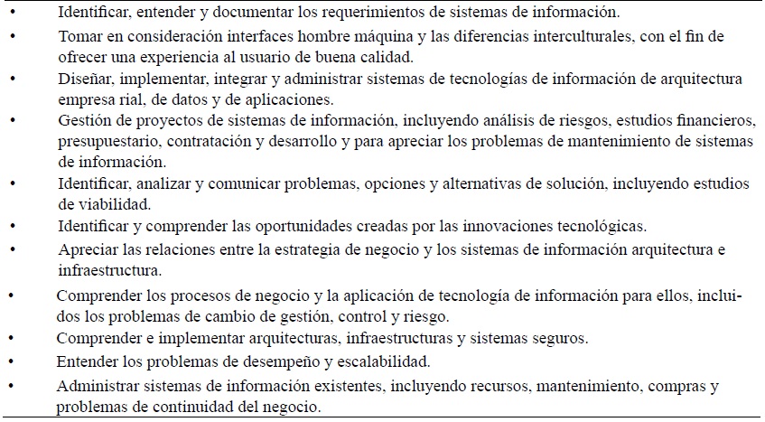 La ACM/AIS/IEEE basa su propuesta en cinco itinerarios que clasifican las competencias y dan una visión más específica para el profesional. A la carrera de Computación e Informática de la UNA le interesa revisar el itinerario de sistemas de información, el cual forma parte del perfil actual del plan de estudios. Según esta propuesta curricular para los programas de grado en Sistemas de Información, en que destaca, además, que deben cumplirse los criterios de la acreditación con ABET, se detallan en la Tabla 2 las competencias para ese énfasis.