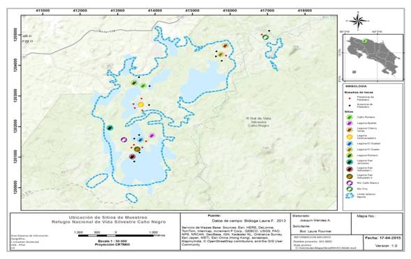 Área de estudio: La toma de muestras se realizó en el humedal del Refugio Nacional de Vida Silvestre Caño Negro (RNVSCN), Costa Rica, en el verano del 2013 (coordenadas geográficas 10°48'12" y 10°57'21" latitud norte, -84°42'30" y -84°45'50" longitud oeste). Este sitio se encuentra entre los 30 y 44 msnm, posee una extensión de 9 969 ha, de los cuales aproximadamente 3 500 ha corresponden a humedales. Cerca de 10 % de su territorio está cubierto por una laguna estacional que, durante la breve estación seca, llega a desaparecer casi por completo, formando una serie de lagunas estacionales variables en su profundidad y extensión, según los cambios en el caudal del río Frío y sus tributarios, escenario que también afecta la disponibilidad de hábitat para los organismos que allí se encuentran (Coloma, Caballero, Ricart y Bueno, 2009; Pacheco, Rodríguez, López y Canessa, 1985; Rojas, 2014; Ruiz, 1995). El área se caracteriza por tener bosques tropicales muy húmedos y, dado su papel regulador de inundaciones y sostén de caudales de los principales ríos o caños, influye en el mantenimiento de la calidad ambiental de la zona Caribe Norte (Coloma et al., 2009).