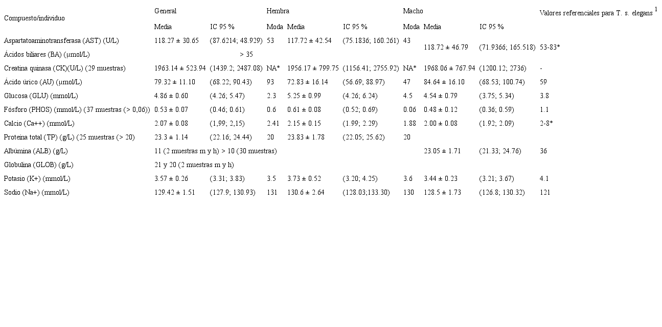 Aunque la interpretación de valores hematológicos se ha utilizado en quelonios para diagnosticar diferentes estados patológicos y evaluar su estado de salud (Hidalgo-Vila et al., 2006), su interpretación precisa se dificulta, debido a la gran variabilidad en los resultados, asociada a factores como edad, sexo, estado reproductivo, dieta, tamaño, condiciones ambientales, posición geográfica y metodología usada (Prieto-Torres et al., 2012). En este sentido, en el presente estudio no se halló diferencias para la química sanguínea ni para el hematocrito entre machos y hembras, excepto para el PHOS. Esto concuerda con hallazgos previos en T. s. callirostris en Colombia (Navarro, Real, Rincón, Villamizar y Arcila, 2005) y en una especie de tortuga terrestre argentina (Chelonoidis chilensis chilensis) (Troiano y Silva, 1998).