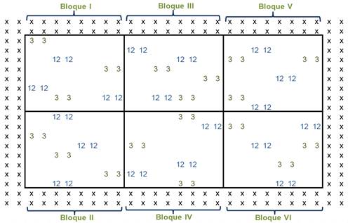 Se utilizó el diseño experimental propuesto por GENFORES para evaluaciones genéticas (Murillo et al., 2004), el cual corresponde a bloques completos al azar con seis repeticiones (figura 1). En cada bloque se distribuyeron aleatoriamente 4 parejas