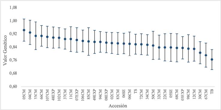La selección de las mejores accesiones se realizó con base en la variable volumen comercial, por resultar ser la de mayor heredabilidad, estabilidad en el tiempo e importancia económica. Con el valor genético promedio de los mejores 10 clones del ensayo, se estimó el diferencial de selección (S) y la ganancia genética a obtener, con relación al testigo semilla comercial sin mejorar (rodal semillero). Para este cálculo se utilizó el valor de la heredabilidad media clonal y la ganancia genética se estimó mediante la ecuación: GG = S * h2 media clonal (Resende, et al. 2018).