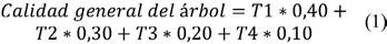 Con la información de la calidad de las trozas de cada árbol, se obtuvo una variable general denominada ‘calidad del árbol’, tomando en cuenta los valores de calidad de cada una de sus trozas, como se observa en la ecuación 1: