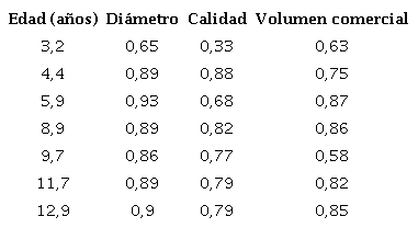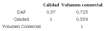 En la tabla 4 se muestran las correlaciones genéticas entre las principales variables del ensayo clonal, a la edad más temprana posible y donde se alcanza la máxima precisión de estimación. Con esto se logra reducir el tiempo de evaluación y selección de los mejores materiales genéticos de 12,9 a 8,9 años. Puede observarse que hubo una correlación débil o no significativa entre la variable calidad y las dos variables de producción (DAP y volumen comercial).