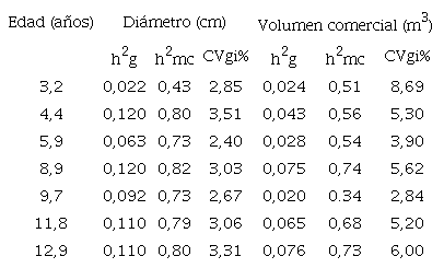 En la tabla 2, se muestran en detalle los valores de los parámetros genéticos más importantes para las variables DAP y volumen comercial. Puede observarse que, para el DAP y el volumen comercial a los 8,9 años de edad, se alcanzan los valores más altos de ambas heredabilidades, así como de su coeficiente de variación genética. Pero sufren una ligera caída a los 5,9 años y a los 9,7 años de edad (tabla 2). Se observa también que, en ambos casos, todos los parámetros vuelven a recuperarse dos años después de esa caída, como se observa en las mediciones de 8,9 y 11,8 años de edad.