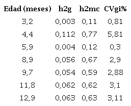 Parte importante en el análisis de datos es la veracidad o certeza de la información obtenida. Selegen genera un parámetro que denomina ‘exactitud o precisión de los datos’ (escala de 0,0 a 1,0), como se muestra en la tabla 1, importante para decidir sobre la confiabilidad de los resultados. Pueden observarse valores muy altos de exactitud en general (râa > 0,7 Resende, 2016) para todas las siete edades y los tres caracteres evaluados, que se estabilizan a partir de los 4,4 años de edad, con cambios leves de los parámetros a través del tiempo. La mayor precisión para las tres variables simultáneamente se alcanza y estabiliza a partir de 8,9 años.