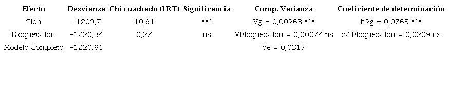 El análisis de desvianza corrobora la existencia de diferencias significativas al 0,999% entre clones, pero no así en la interacción BloquexClon, tal y como se muestra en la tabla 5 El componente de varianza genético y la heredabilidad también resultaron significativamente diferentes de cero.