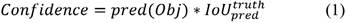 represents the common value between predicted and reference bounding box and pred(Obj) = 1, if the target is in the grids, otherwise it would be 0.
