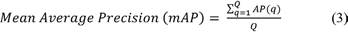 Average precision (AP) is a measure that integrates recall and precision for good results. It splits into 4 kinds to perform a binary classification on the image: true positive TP, false negative FN, true negative TN, and false positive FP, according to the fusion of predicted class and labeled class of the proposed model. Average precision is the mean of the precision scores after every significant document is retrieved. The formula to calculate precision and mean average precision is given in equation 2: