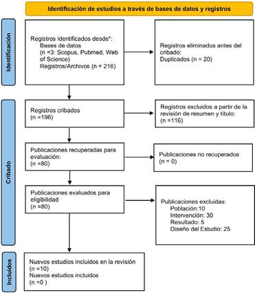 En total, se identificaron 216 estudios, obtenidos a partir de tres bases de datos (Pubmed, Scopus y Web of Science). Después de eliminar 20 duplicados, quedaron 196 artículos para la revisión de títulos y resúmenes, y 116 fueron excluidos por no cumplir con los criterios de inclusión. Por lo tanto, 80 artículos se sometieron a una evaluación de texto completo de su elegibilidad. En 10 artículos, la población no incluyó exclusivamente estudios sobre la especie A. muricata, 30 no cumplieron con el criterio de intervención referido a estudios sobre el cáncer, cinco no cumplieron con el criterio de resultado y 25 no cumplieron con el tipo de diseño de estudios considerados. Al final, se seleccionaron 10 estudios que fueron elegibles para una revisión narrativa completa (Figura 1).