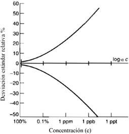 Con respecto al coeficiente de variación de Horwits, se hizo el análisis al reflexionar que la desviación estándar de uno de los patrones utilizados varía con la concentración del analito. Una aproximación para esta variación es el empleo de una relación funcional entre la concentración y la desviación estándar. La relación óptima que se conoce es la trompeta de Horwitz, la cual fue obtenida a partir de un estudio estadístico (Figura 1), para el cual el coeficiente de variación de los valores medios dados por diferentes laboratorios aumentaba conforme disminuía la concentración del analito, se demostró así que la desviación estándar relativa de un método varía con la concentración, de acuerdo con la Ecuación 1 (Miller y Miller, 2002).