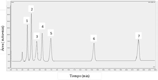 La Figura 2 muestra un ejemplo de cromatograma obtenido por la inyección de los patrones de las hidrazonas. La Tabla 1 presenta las concentraciones de las disoluciones madres de hidrazonas preparadas para cada aldehído. Las disoluciones patrón preparadas a partir de la disolución madre se exponen la Tabla 2, con su respectiva incertidumbre.