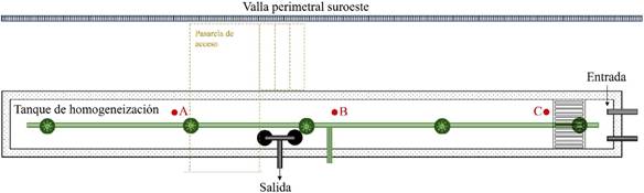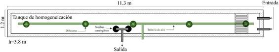 El tanque homogeneizador en estudio fue diseñado para un tiempo de retención de siete horas y cuenta con las siguientes dimensiones: 11,3 m de largo, 1,2 m de ancho y 3,8 m de altura total (figura 1). Está equipado con cinco difusores de membrana tipo disco (Blowtac), colocados en fila a lo largo del fondo. La salida del agua es a través de dos bombas sumergibles en uno de los laterales.