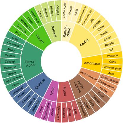 La encuesta midió intensidad, ofensividad y carácter de los olores. La escala de carácter, intensidad y ofensividad se basó en las recomendaciones de Burlingame (2009). La pregunta de carácter está acompañada de una rueda de olores (figura 3), traducida al español y apoyada en los grupos propuestos por Burlingame (2009) y Suffet y Rosenfeld (2007). Finalmente, se solicitó la fecha y hora de llenado de la encuesta, más características del receptor.