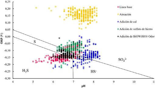 En la figura 4, se presentan los resultados de la correlación de los parámetros pH y ORP, durante la aplicación de las medidas de control de olores, los cuales se posicionaron a escala sobre el diagrama de dispersión de Pourbaix Oliveira et al. (2017), donde se describe la distribución de las especies de sulfuro (ORP en función del pH) en condiciones de equilibrio en sistemas hídricos. Dicha representación tiene como objetivo valorar si las medidas de control aplicadas desplazan las condiciones de la unidad lejos de la zona del diagrama gobernada por el H2S, recordando que este es la única especie de tal diagrama que puede ser transferida a la fase gaseosa y causar emisiones de olores ofensivos (Talaiekhozani, 2016).