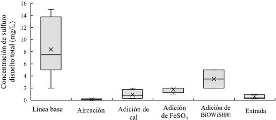 En el caso de la aireación, se removieron y previnieron sulfuros disueltos. Se presenta remoción, ya que el agua de entrada de la PTAR reportó un promedio de 0,6 mg/L, mientras que la unidad en el periodo de aireación mostró concentraciones menores (< 0,2 mg/L). Las medidas de adición de cal, sulfato de hierro y BiOWiSH® Odor disminuyeron la concentración de sulfuro en función de la línea base.