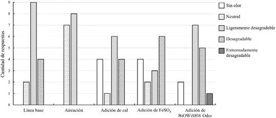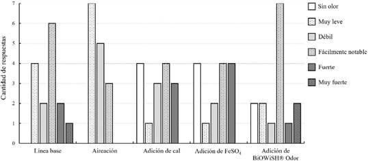 A pesar de que la adición de cal, adición de sulfato de hierro y adición de BiOWiSH® Odor generaron una disminución de sulfuro total y del H2S, no mostraron un cambio significativo en ninguna de las categorías de percepción del olor, basado en las variables intensidad y ofensividad del olor. Al igual que en la línea base, todas muestran presencia de la categoría de ofensividad “desagradable” con una intensidad de “fuerte” a “muy fuerte”. Esto puede ser debido a que la mitigación de H2S es un tema ampliamente recopilado y central en la problemática de olores, sin embargo, su control no asegura la disminución de la intensidad y ofensividad de estos (Suffet et al., 2007).