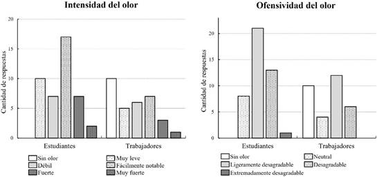 Al categorizar los grupos encuestados en estudiantes y trabajadores, se encontró una diferencia significativa en la percepción de los grupos, en torno a la intensidad y ofensividad bajo las mismas condiciones (figura 8). Los trabajadores reportaron una baja intensidad y ofensividad del olor, mientras que los estudiantes encontraron los hedores mucho más intensos y ofensivos. Esto pudo darse por las características y el contexto de los encuestados que influencian la percepción del olor (Van Harreveld, 2001), ya que los estudiantes realizan la visita aleatoriamente y los trabajadores están más habituados.
