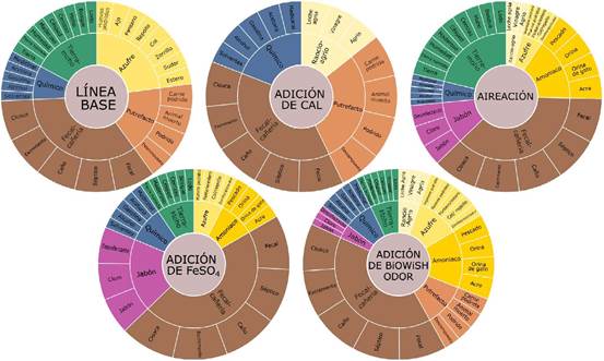 Como parte los productos de la investigación se adaptaron de la literatura ruedas de olor, con el objetivo de identificar lo percibido antes y durante la aplicación de las medidas de control; las respuestas se pueden observar en la figura 9. En todas las ruedas de olores generadas en el estudio, se encuentra el grupo “fecal-cañería”. Los compuestos escadol e indol son frecuentemente asociados con un olor fecal, son percibidos y reconocidos a bajas concentraciones (Zhou et al., 2016); sin embargo, no se tiene evidencia de que sean los odorantes responsables, por lo que las respuestas en la categoría “fecal” pueden deberse a las influencias visuales y al contexto durante la realización de la encuesta.