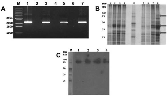 By RT-PCR, the cDNA was obtained with an approximate size of 2000 bp, which corresponds approximately to the expected size of the hsp83 molecule of T. cruzi.Figure 1A shows the bands obtained by RT-PCR from the RNA samples extracted with the different commercial kits. For gene expression, M15 transformed cells were induced with IPTG, control aliquots were taken from uninduced cells and post-1, 2, and 3 hours of induction, and analyzed on Coomassie-Silver stained acrylamide gel. The expected size of the recombinant protein, according to the deduced amino acid sequence, is 80.7 kDa + 1 kDa of the histidine tail; so, a molecular weight of almost 83 kDa would be expected. Figure 1B shows the discrete expression of a protein of nearly 83 kDa in sample two at the second hour of incubation and slightly higher at the third hour. Additionally, bands that are not present in the uninduced control are observed and appear at the second and third hour of post-induction (Figure 1B); perhaps they are truncated forms of the protein, which the bacteria tend to eliminate.