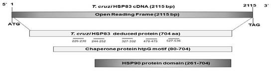 study of both the genes and the proteins they encode, as well as their use as tools in tests that help to elucidate the cellular mechanisms in which they are involved. In the present study, it was possible to clone and express the gene encoding the heat shock protein HSP83 from T. cruzi. To date, there are merely two old reports about cloning this molecule (Dragon et al.; 1987; Nadeau et al.; 1992), and only its genomic structure and ATPase activity have been studied. In addition, cloning and expression of the gene encoding HSP83 has been obtained in other tripanosomatids, such as Trypanosoma brucei (Mottram et al.; 1989), Hsp83 from Leishmania mexicana amazonensis (Shapira & Pinelli, 1989), Hsp83 of Leishmania infantum (Angel et al.; 1996), and Hsp83 from Leishmania braziliensis(Silva et al.; 2013; Menezes-Souza et al.; 2014).