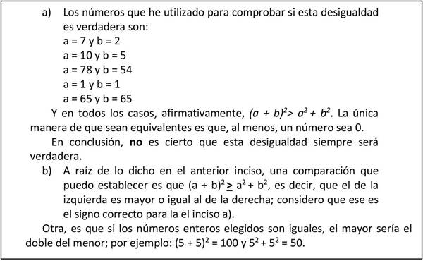 a) Si a y b son dos números enteros, ¿será cierto que siempre (a + b)2 > a2 + b2? ¿O será necesario pedir alguna condición para que esta desigualdad sea verdadera?