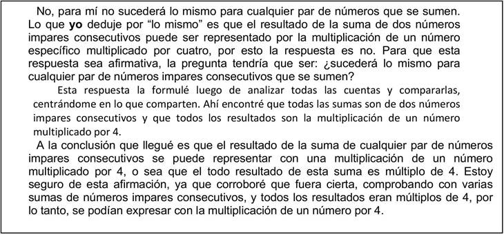 P: ¿Cómo podés estar seguro de que tu conclusión se cumple siempre?B: Porque los números consecutivos impares son el 1, el 3, el 5, el 7 y el 9. Y siempre la suma de esos dos números, por ejemplo 135 más 137, o sea, el número que sea, siempre va a dar…, o sea, el último número va a ser múltiplo de 4.P: ¿Cómo estás seguro de eso?B: Porque 1 más 3 da como resultado 4; los otros números consecutivos son 3 y 5, y 3 más 5 da como resultado 8; después 5 más 7 como resultado da 12; 7 más 9 como resultado da 16 y gracias a eso me doy cuenta de que son todos múltiplos de 4.P: ¿Y cómo te das cuenta de que un número “grande” es múltiplo de 4? ¿Qué usás para darte cuenta?B: El número final.