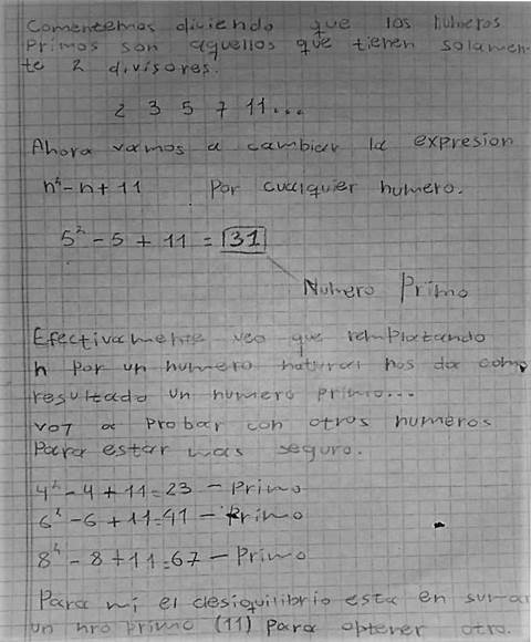 P: ¿Vos podés asegurar que obtenés como resultado un número primo?C: Y, dentro de todo, sí.P: ¿Qué sería dentro de todo?C: Y, que tampoco voy a poner las manos en el fuego de que voy a tener un número primo sí o sí.P: ¿Y por qué no? ¿Por qué no pondrías las manos en el fuego?C: O sea, estoy seguro, pero… Bueno, sí, pongo las manos en el fuego.P: ¿Qué pensás que te falta para po der asegurarlo?C: Debería cambiar la expresión de n por todos los números y ver si todos me dan primo. Ahí sí estaría segurísimo. Pero como yo lo hice tres veces, o cuatro…