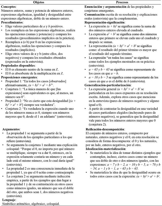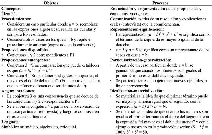 Finalmente, podemos identificar un nuevo conflicto semiótico asociado al proceso dual de representación-significación dado que, en un principio, el estudiante no logra otorgar otro contenido a la expresión (a + b)² (como por ejemplo el cuadrado de un binomio o el producto (a + b) . (a + b)), lo que le habría permitido establecer comparaciones con a² + b². No significar de otra manera esta representación obstaculiza el avance hacia la materialización de una argumentación general. En la entrevista, se intenta que el alumno transite este proceso de significación, aunque no se alcanza a avanzar hacia el tipo de argumentación pretendida.