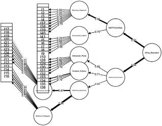 Como se observa en la Tabla 4, las confiabilidades de las escalas de ambos modelos son aceptables pues son superiores a 0.70; sin embargo, el modelo propuesto muestra mejores indicadores en todas las escalas, en comparación con los obtenidos utilizando el modelo original, cuyos indicadores son ligeramente superiores a los presentados en el estudio de Juárez (2014). Esto no significa que un modelo sea mejor que otro, solo que ambos muestran una adecuada consistencia interna de sus respectivas escalas. Además, ambos análisis mantienen la dimensión de interacción educativa, así como los factores de estructura organizacional, interacción con el contexto exterior, la interacción entre pares y la interacción docente-estudiante, aunque no con los mismos ítems en todos los casos.