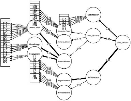 Finalmente, la Gráfica 4 resume nues tra propuesta en cuanto a las dimensiones y factores del constructo de clima educativo basado en el modelo SEM, propuesto a partir del AFE desarrollado en esta investigación, en contraposición a la propuesta de Juárez (2014), presentada en la Gráfica 1.